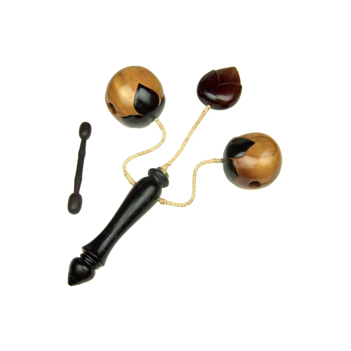 Este instrumento é uma combinação de dois blocos de madeira e um disco de madeira com uma fenda.